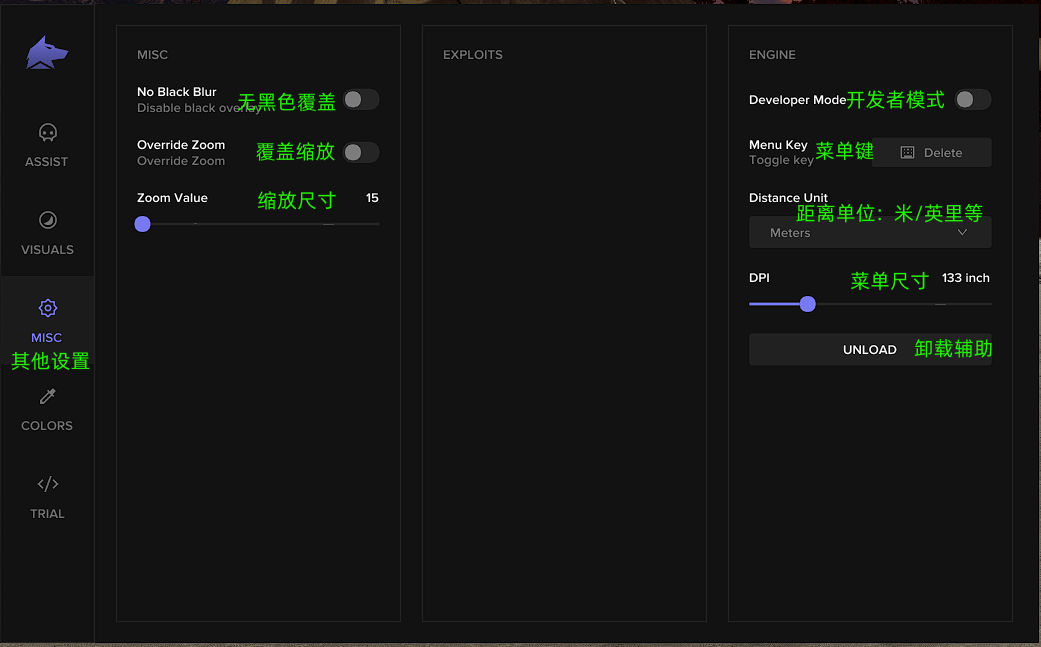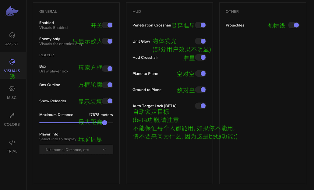 部分主要功能: (每次更新辅助功能列表可能会有稍微差异, 实际以游戏内列表为准